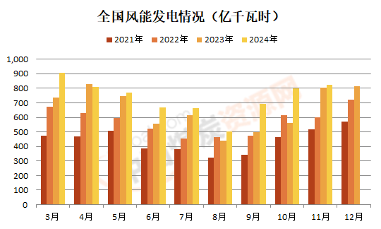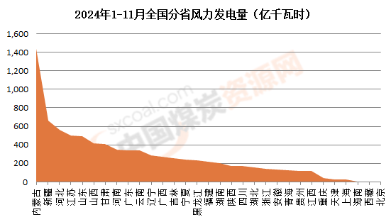 2024年1-11月份,全國風力發(fā)電量為8,437.7億千瓦時,同比增長11.5%,風電發(fā)力與往年同期相比增長明顯。其中,累計發(fā)電量前五的省份為內蒙古、新疆、河北、江蘇、山東。