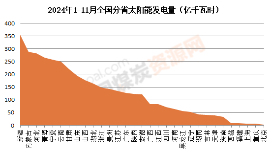 與風電相比,光伏發(fā)電的增長幅度更大。2024年1-11月份,全國光伏發(fā)電量為3,856.4億千瓦時,同比增長27.8%。其中,累計發(fā)電量前五的省份為新疆、內蒙古、河北、青海、寧夏。