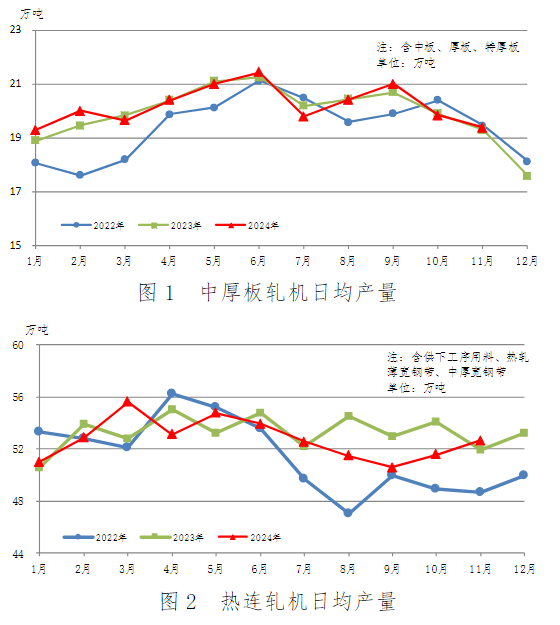 中厚板軋機(jī)11月份生產(chǎn)特厚板、中厚板581萬噸,同比增加2萬噸,上升0.4%,產(chǎn)量小幅回升;累計(jì)生產(chǎn)6750萬噸,同比增加144萬噸,上升2.2%。
