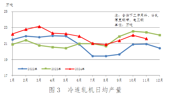 冷連軋機(jī)11月份生產(chǎn)649萬噸,同比減少23萬噸,下降3.4%,產(chǎn)量降幅擴(kuò)大;其中商品量427萬噸,同比減少34萬噸,下降7.5%;供下工序用料222萬噸,同比增加12萬噸,上升5.7%。冷連軋機(jī)累計(jì)生產(chǎn)7339萬噸,同比增加307萬噸,上升4.4%。