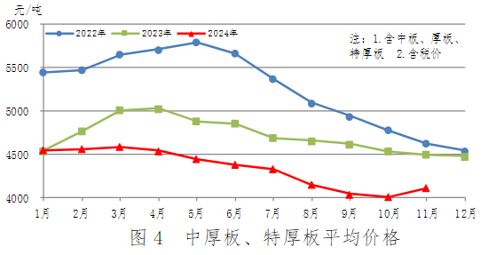 11月份,中厚板產(chǎn)量506萬噸,同比增加4萬噸,上升0.8%;銷售505萬噸,其中出口36萬噸,產(chǎn)銷率99.8%;售價(jià)4071元/噸,比上月上漲111元/噸。累計(jì)產(chǎn)量5840萬噸,同比增加162萬噸,上升2.9%。中厚板、特厚板平均價(jià)格見圖4。