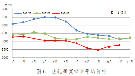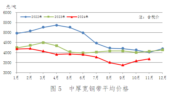 11月份,中厚寬鋼帶產(chǎn)量675萬噸,同比增加10萬噸,上升1.5%;銷售668萬噸,其中出口51萬噸,產(chǎn)銷率99.0%;售價(jià)3674元/噸,比上月上漲98元/噸。累計(jì)產(chǎn)量7374萬噸,同比減少349萬噸,下降4.5%。中厚寬鋼帶平均價(jià)格見圖5。