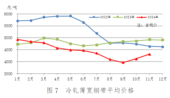 11月份,冷軋薄寬鋼帶產(chǎn)量327萬噸,同比減少39萬噸,下降10.6%;銷售319萬噸,其中出口18萬噸,產(chǎn)銷率97.6%;售價(jià)4311元/噸,比上月上漲193元/噸。累計(jì)產(chǎn)量3770萬噸,同比增加67萬噸,上升1.8%。冷軋薄寬鋼帶平均價(jià)格見圖7。