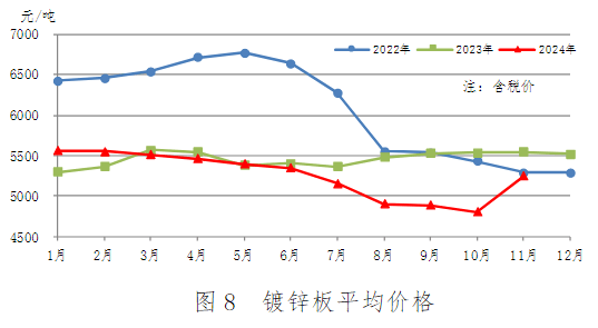 11月份,鍍鋅板產(chǎn)量232萬噸,同比增加9萬噸,上升4.2%;銷售234萬噸,其中出口16萬噸,產(chǎn)銷率100.9%;售價(jià)5250元/噸,比上月上漲445元/噸。累計(jì)產(chǎn)量2490萬噸,同比增加173萬噸,上升7.5%。鍍鋅板平均價(jià)格見圖8。