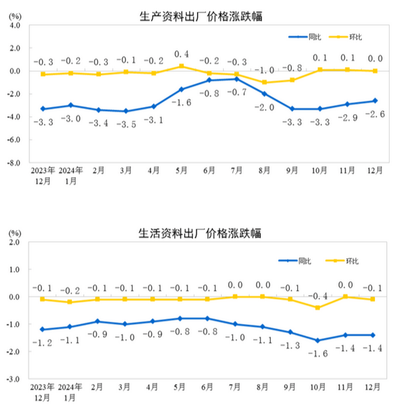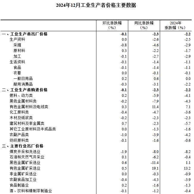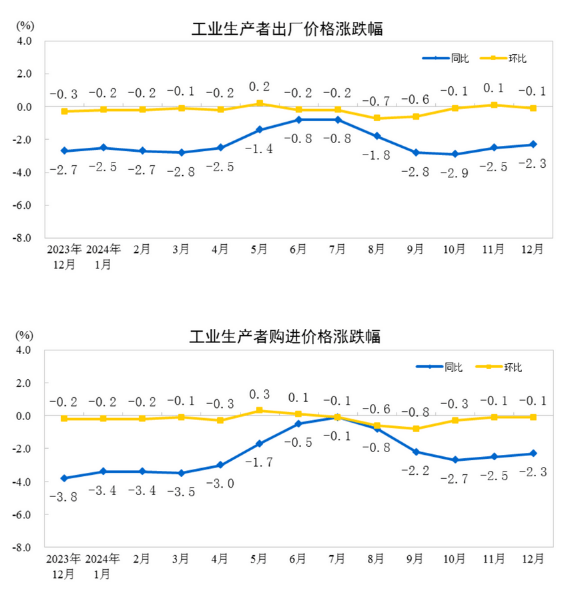 2024年12月份,全國工業(yè)生產(chǎn)者出廠價格和購進(jìn)價格同比均下降2.3%,降幅比上月均收窄0.2個百分點(diǎn);環(huán)比均下降0.1%。2024年全年,工業(yè)生產(chǎn)者出廠價格和購進(jìn)價格均下降2.2%,降幅比上年分別收窄0.8、1.4個百分點(diǎn)。