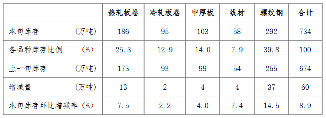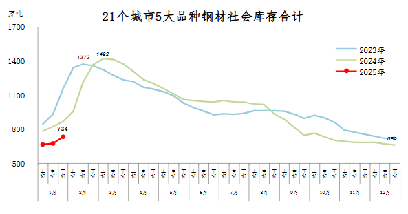 1月下旬,21個(gè)城市5大品種鋼材社會(huì)庫(kù)存734萬(wàn)噸,環(huán)比增加60萬(wàn)噸,上升8.9%,庫(kù)存升幅擴(kuò)大;比年初增加75萬(wàn)噸,上升11.4%;比上年同期減少132萬(wàn)噸,下降15.2%。