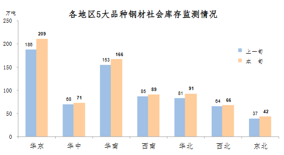 1月下旬,分地區(qū)來(lái)看,七大區(qū)域鋼材庫(kù)存環(huán)比均有不同程度上升。具體情況為:華東庫(kù)存環(huán)比增加23萬(wàn)噸,上升12.4%,為增量最大地區(qū);華南增加13萬(wàn)噸,上升8.5%;華北增加10萬(wàn)噸,上升12.3%;東北增加5萬(wàn)噸,上升13.5%,為增幅最大地區(qū);西南增加4萬(wàn)噸,上升4.7%;華中增加3萬(wàn)噸,上升4.4%;西北增加2萬(wàn)噸,上升3.1%。