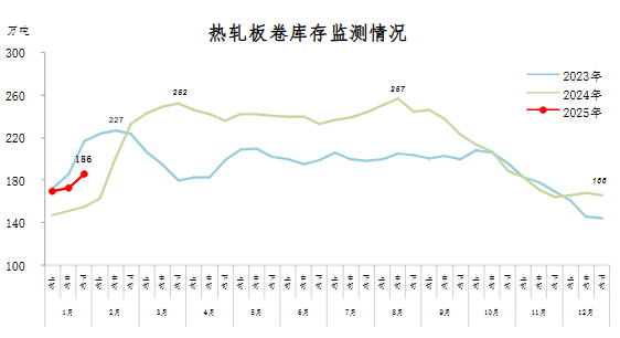 1月下旬,熱軋板卷庫(kù)存186萬(wàn)噸,環(huán)比增加13萬(wàn)噸,上升7.5%,庫(kù)存上升幅度擴(kuò)大;比年初增加20萬(wàn)噸,上升12.0%;比上年同期增加31萬(wàn)噸,上升20.0%。
