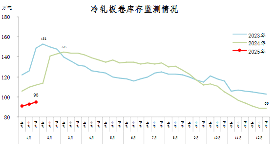 1月下旬,冷軋板卷庫(kù)存95萬(wàn)噸,環(huán)比增加2萬(wàn)噸,上升2.2%,庫(kù)存繼續(xù)小幅上升;比年初增加6萬(wàn)噸,上升6.7%;比上年同期減少17萬(wàn)噸,下降15.2%。