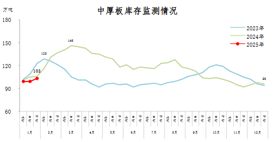1月下旬,中厚板庫(kù)存103萬(wàn)噸,環(huán)比增加4萬(wàn)噸,上升4.0%;比年初增加7萬(wàn)噸,上升7.3%;比上年同期減少3萬(wàn)噸,下降2.8%。