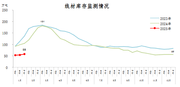 1月下旬,線材庫(kù)存58萬(wàn)噸,環(huán)比增加4萬(wàn)噸,上升7.4%,庫(kù)存升幅擴(kuò)大;比年初增加2萬(wàn)噸,上升3.6%;比上年同期減少47萬(wàn)噸,下降44.8%。