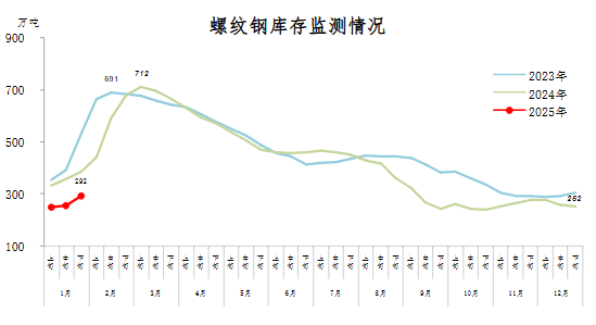 1月下旬,螺紋鋼庫(kù)存292萬(wàn)噸,環(huán)比增加37萬(wàn)噸,上升14.5%,庫(kù)存增速較快;比年初增加40萬(wàn)噸,上升15.9%;比上年同期減少96萬(wàn)噸,下降24.7%。