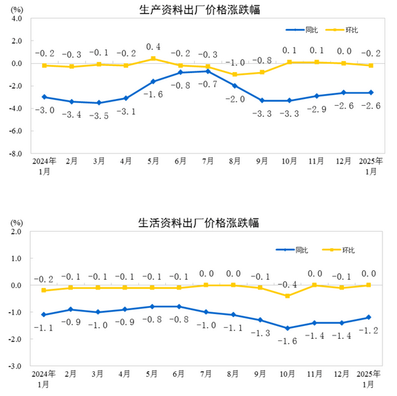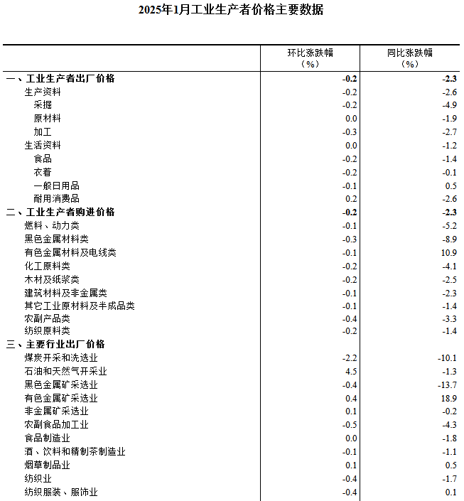 2025年1月份,全國工業(yè)生產者出廠價格和購進價格同比均下降2.3%,降幅均與上月相同;環(huán)比均下降0.2%。