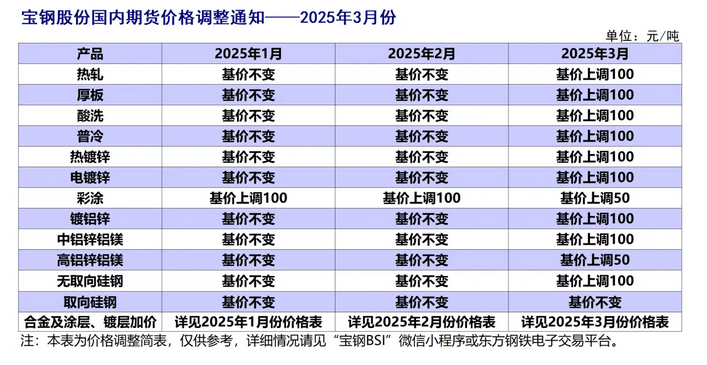 經(jīng)研究決定,寶鋼股份板材內(nèi)銷價(jià)格2025年3月份在2025年2月份基礎(chǔ)上調(diào)整公告如下(以下除特殊注明外,均為不含稅):